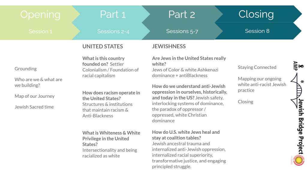 Using the Jewish values of “Tikkun Olam, Repairing The World,” and deep reflective inquiry, this project aspires to build a bridge to transformational anti-racist engagement. The Jewish Bridge Project offers this Jewish Justice Circle: Awakening to whiteness (JJC:A2w) as a guided process for white Jewish people in exploring whiteness, white supremacy, racism, antiBlackness, antiJewish oppression, ancestral trauma, settler colonialism, christian dominance and capitalism in the U.S. today. The course facilitates a practice of undoing racism at personal, institutional, and structural levels. The curriculum focuses on teaching historical context, honoring personal (ancestral, somatic, emotional, spiritual) experience, defining common terms within the Jewish justice ethic, and exploring the interplay of antisemitism, racism, capitalism, and white supremacy both within our Jewish institutions and in the U.S. at large. The Jewish Bridge Project embraces the wisdom that living in a less brutal and racist culture benefits all members of society.